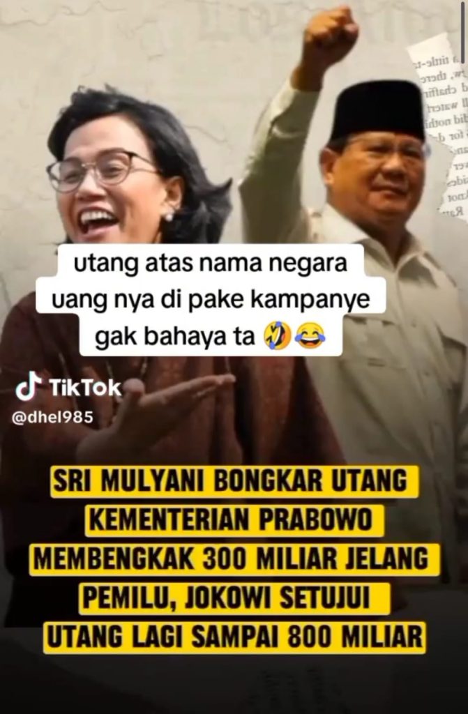 Pada video tersebut juga memuat kalimat: “utang atas nama negara uang nya di pake kampanye gak bahaya ta.” Kemudian “MENDEKATI MASA PEMILU, MENTERI KEUANGAN SRI MULYANI MEMBEBERKAN BEBAN UTANG NEGARA PADA KEMENTERIAN PERTAHANAN.”