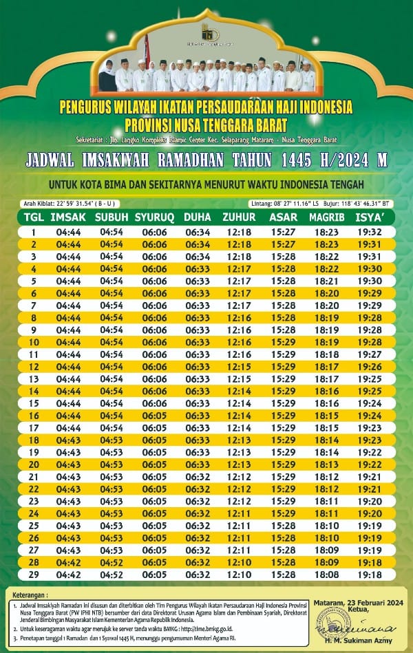 Berikut ini adalah jadwal Imsakiah puasa Ramadan 1445 Hijriah atau tahun 2024 Masehi untuk wilayah Kota Bima NTB: