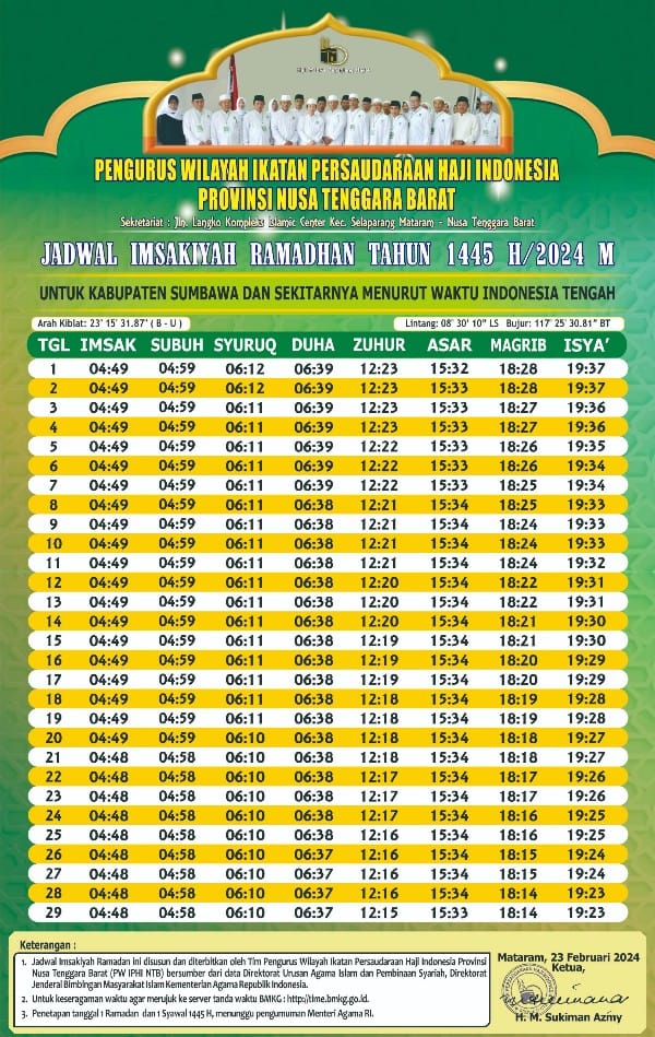 Berikut ini adalah jadwal Imsakiah puasa Ramadan 1445 Hijriah atau tahun 2024 Masehi untuk wilayah Sumbawa Barat NTB: