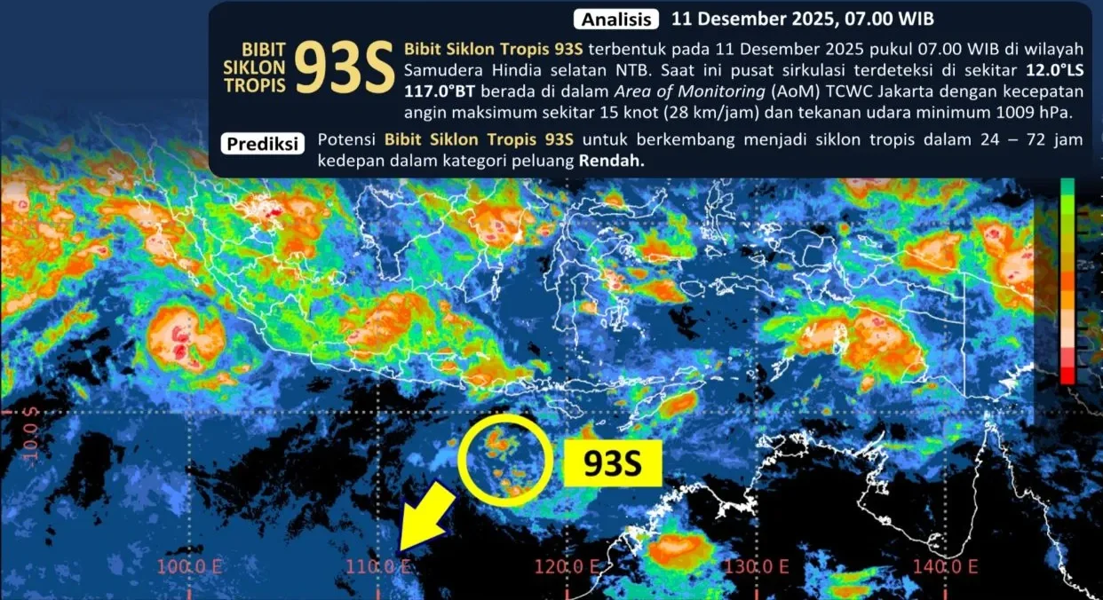 Bibit Siklon 93S mulai terdeteksi pada 11 Desember 2025 pukul 07.00 WIB dengan pusat sirkulasi di sekitar 12.0°LS – 117.0°BT dan masuk dalam Area of Monitoring (AoM) Tropical Cyclone Warning Centre (TCWC) Jakarta.
