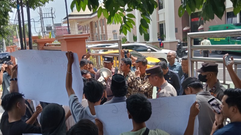 Ketua Pengadilan Negeri Mataram, Ary Wahyu Irawan didampingi Humas Pengadilan Negeri Mataram, Kelik Trimargo menemui massa.